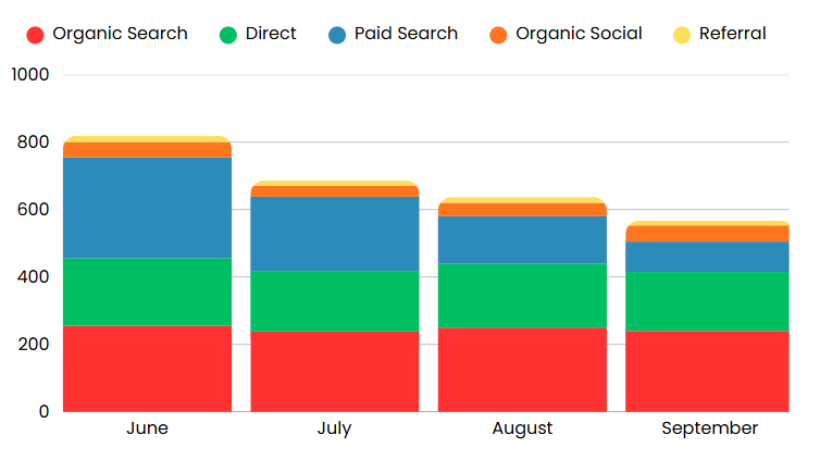 If you see traffic from one source dropping when all the others are staying roughly the same month-on-month, that tells you there might be an issue with that marketing channel. In this case it’s obvious that there is an issue with Paid Search (Google Ads), and you need to dig into what’s happening.