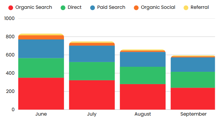 Seeing month by month traffic source data isn’t built into Analytics (amazingly). If you get a monthly website performance report from a marketing agency, they will be able to include a month-on-month graph. The other way to do it is to grab the data and make a graph yourself.
