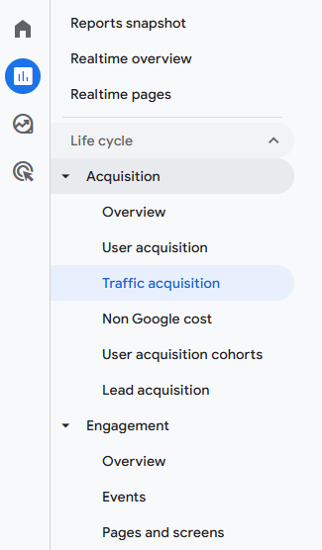 The key metric that can tell you what is happening with your website, and by extension your business, is called traffic acquisition. It’s under Report – Acquisition when you are in Google Analytics.